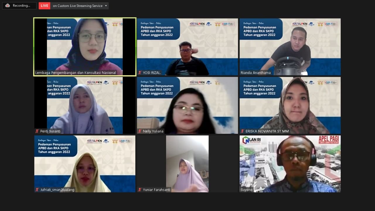 Jakarta, 04 November 2021 Lembaga Pengembangan dan Konsultasi Nasional (LPKN) kembali menyelenggarakan Bimbingan Teknis - Online Pedoman Penyusunan APBD dan RKA SKPD TA 2022 yang diselenggarakan pada tanggal 25-30 Oktober 2021. Peserta Pelatihan ini berjumlah 55 peserta. Walaupun pelatihan ini melalu Zoom, keakraban tetap terjalin antara peserta, panitia, dan narasumber.