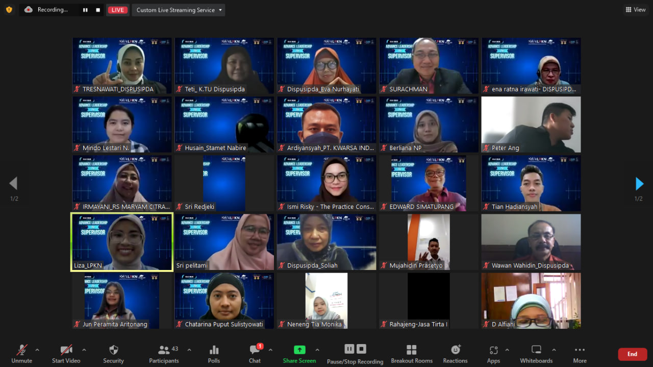 Jakarta, 12 April 2023 Lembaga Pengembangan dan Konsultasi Nasional (LPKN) kembali menyelenggarakan Kelas Online Advance Leadership For Supervisor pada tanggal 10-12 April 2023. Peserta Pelatihan ini berjumlah 53 peserta. Walaupun pelatihan ini melalu Zoom, keakraban tetap terjalin antara peserta, panitia, moderator dan narasumber.